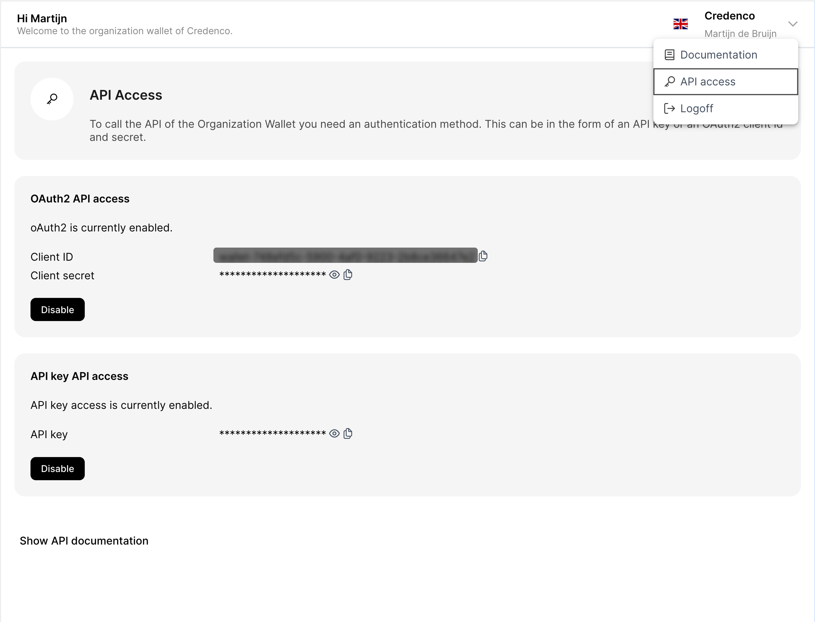 To be able to use the authentication methods, you need to enable the method in the Business Wallet. Login to the Business Wallet and go to API Access from the profile menu.